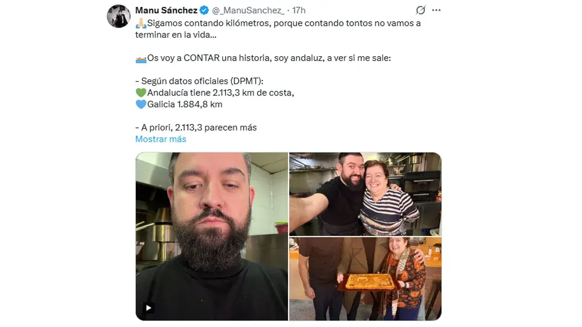 Con datos oficiales del Dominio Público Marítimo-Terrestre (DPMT), Sánchez recordó que Andalucía cuenta con 2.113,3 kilómetros de costa, frente a los 1.884,8 de Galicia. “A priori, 2.113,3 parecen más que 1.884,8 (confirmad, por favor, los no andaluces)”, ironizó, acompañando sus palabras con emojis y referencias a la cultura popular.